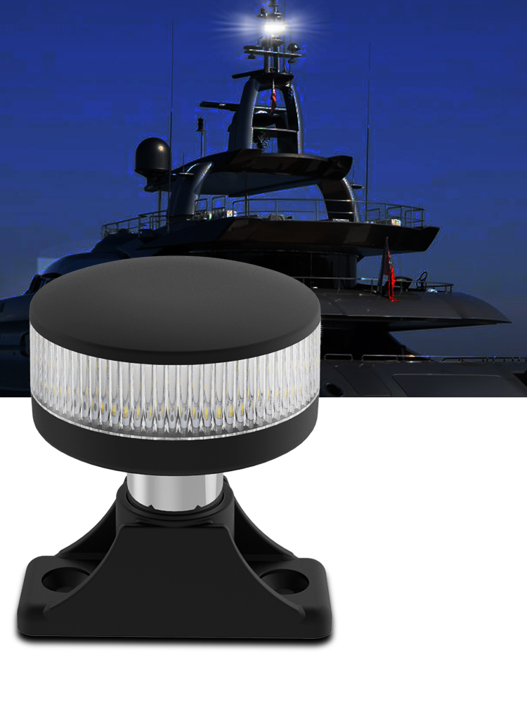 This fixed-installation LED all-round light is constructed from corrosion-resistant plastic and stainless steel, featuring an LED bulb. It provides 2 nautical miles visibility with a 360-degree lighting angle. Rated IP65 for water resistance, it ensures reliable performance in marine environments.